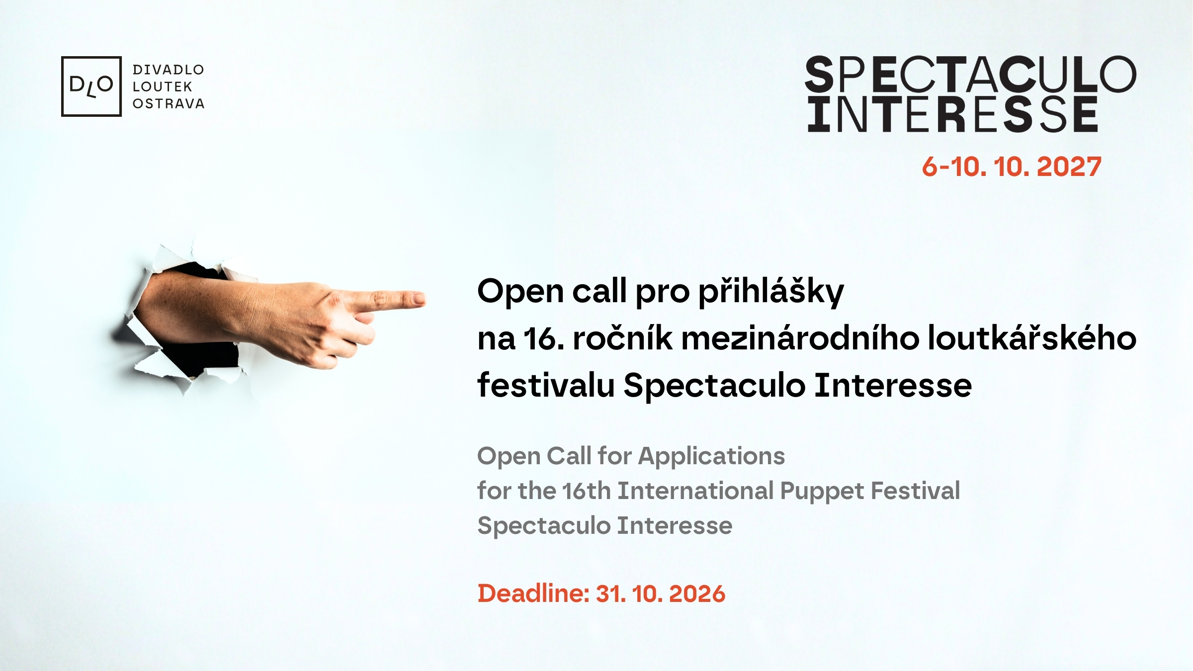 16. ročník mezinárodního festivalu Spectaculo Interesse se uskuteční v termínu 6. – 10. října 2027 a my jsme otevřeli brány pro vaše přihlášky! Ty můžete vyplnit a zaslat nejpozděj...
